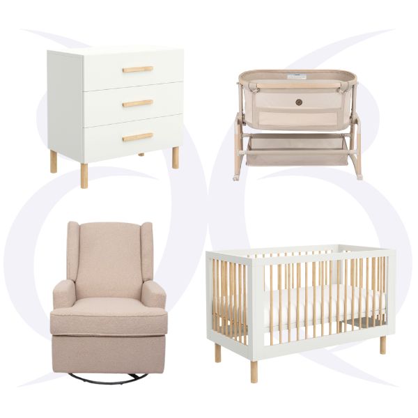 The Babyroad Furniture Package includes the Torquay Cot, Comficore Mattress & Torquay Chest, Maxi Cosi Iora Co Sleeper and your choice of Love n Care Glider Mila or Luna