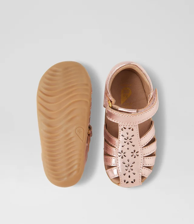 This Bobux Step Up Chelsea Infant Rose Gold Leather Sandals are stylish and practical design for warm weather, HARBOR has an open silhouette crafted from leather and a single strap for quick, easy fastening. Fully enclosed at the heel and partially enclosed at the toe for a protective but breathable fit, the pair is finished with a flexible sole that embodies our philosophy on natural movement. This design is suitable for first walkers.