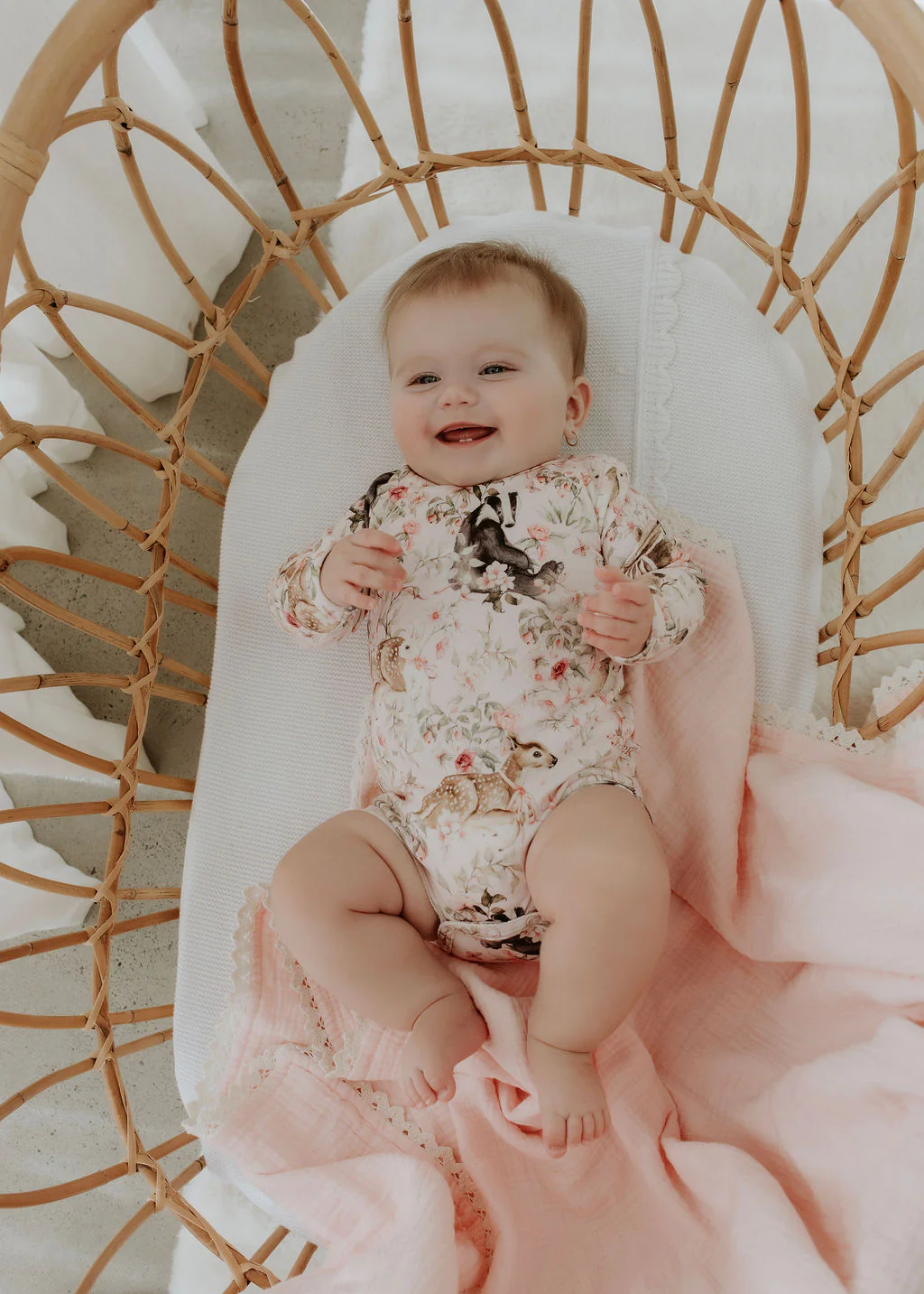 The Confetti Kidz Pink Forest Baby Animals Bodysuit features the sweetest hand-painted woodland animals nestled amongst delicate florals on a soft baby pink base, creating a truly storybook feel., ultra-soft bamboo that’s breathable, gentle and super comfy on delicate skin. Designed for easy dressing, it’s a timeless everyday essential made for little adventurers.