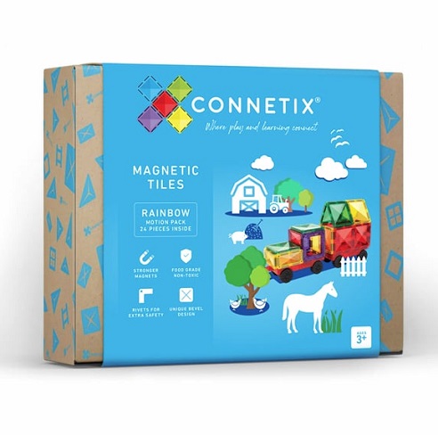 The Connetix 24 Piece Rainbow Piece Motion Pack featuring two car bases with REAL rubber wheels and our unique bevel design, this pack also includes a variety of tiles and is the perfect gift for vehicle enthusiasts.