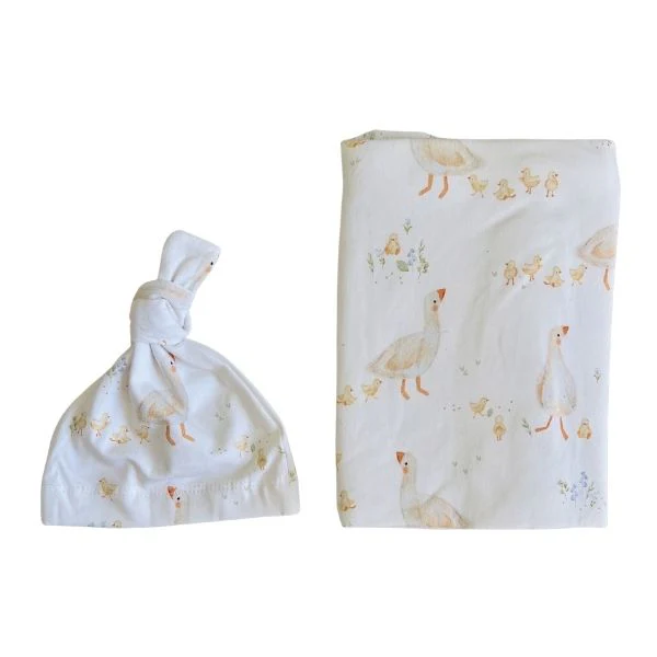 The Cuddle Bug & Co Baby Wrap Set Goosey Gander is luxuriously soft & stretchy. It comes with a matching topknot headband, perfect for your newborns birth announcement.