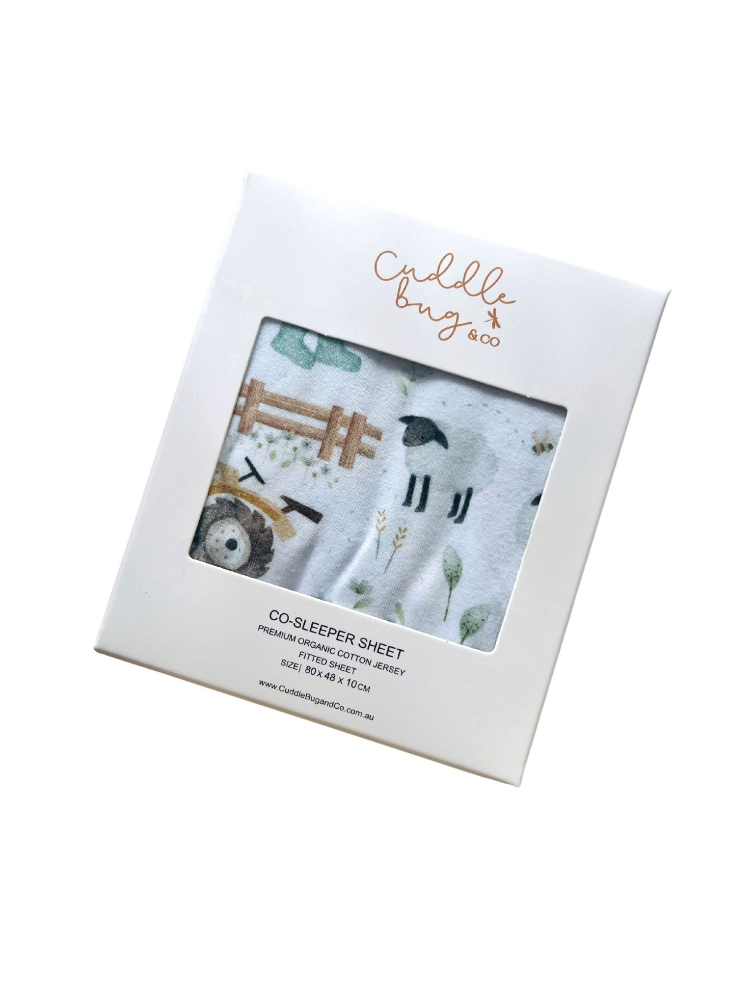 The Cuddle Bug & Co Co-Sleeper Sheet Farm Life is luxuriously soft & stretchy allowing it to fit co-sleeper, cradle & bassinet mattress. Multifunctional – you can use in your co-sleeper, in your pram, the options are endless.