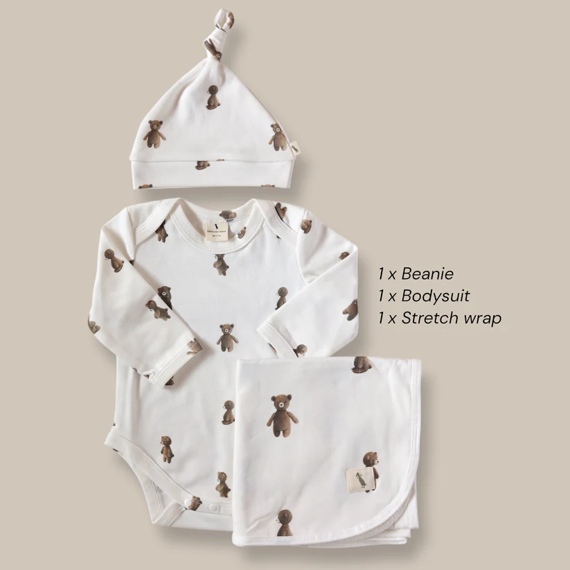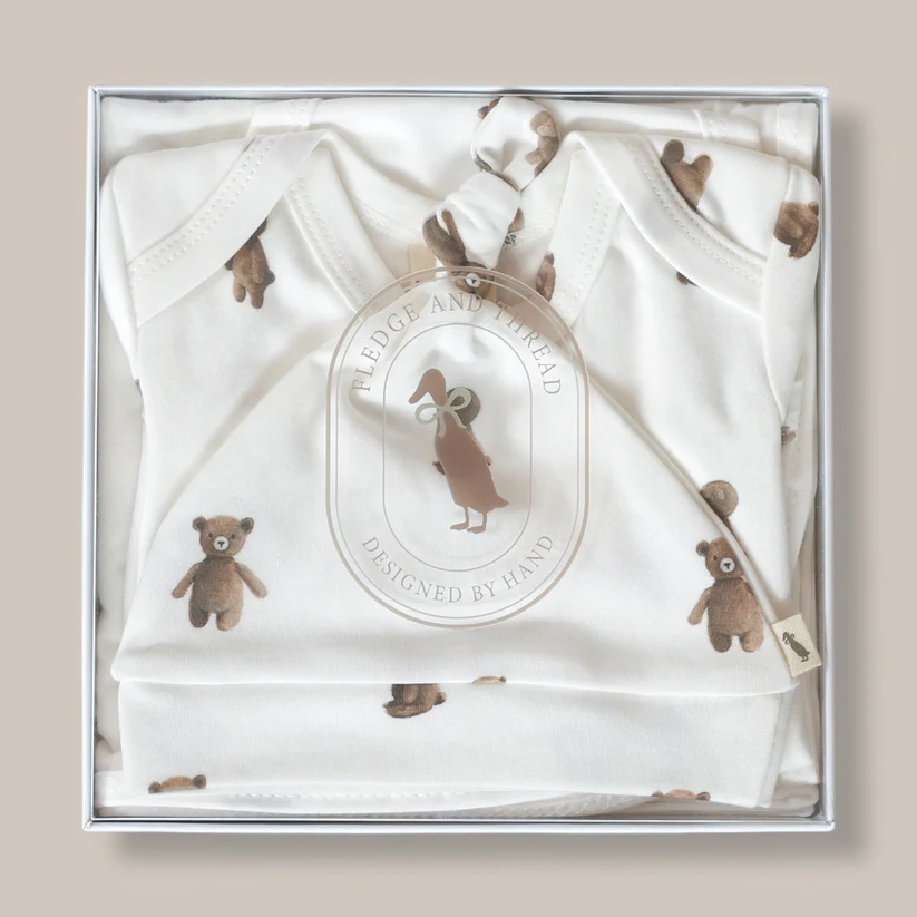 Fledge and Thread Teddy Bear Gift Box thoughtfully curated bundle made to bring joy to new parents and little ones. The set comes thoughtfully packaged, ready for gifting, perfect for baby showers, newborn arrivals, or a heartfelt welcome-home surprise. More than just a gift, this set is a keepsake — something to treasure for those sweet newborn days. Simple, special, and made for celebrating life’s sweetest new beginnings.