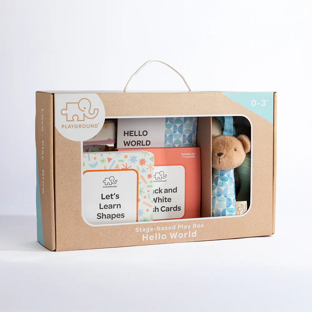 Playground Play Box Hello World is suitable for bubs aged 0 to 3 months old outlines a foundation of core skills that will develop over the coming year. In this box we have carefully curated 5 play offerings to help your little one with the initial concepts of coordination and building strength in their hands, whilst providing visual stimulation to keep them occupied and entertained.