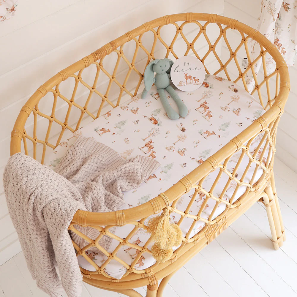 Snuggle Hunny Woodland Tales Organic Bassinet Sheet Change/ Pad Cover made from snuggly soft organic stretch cotton jersey. It is stretchy so fits most bassinet mattress sizes and comes in a matching drawstring bag.